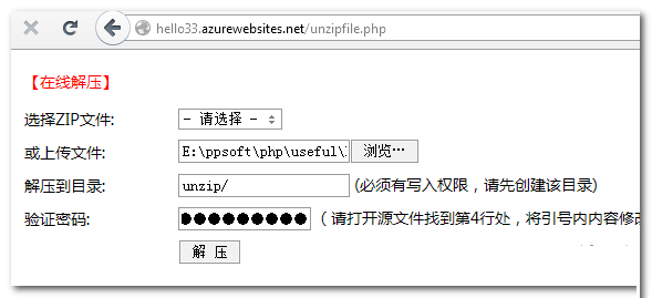 在这个简明的页面中,你可以选择服务器上现有的zip文件(前提是和这个文件同目录),也可以上传zip文件。解压目录保持不变即可,验证密码填写上一部你修改的密码,点击解压,服务器就会自动帮你解压这个文件。