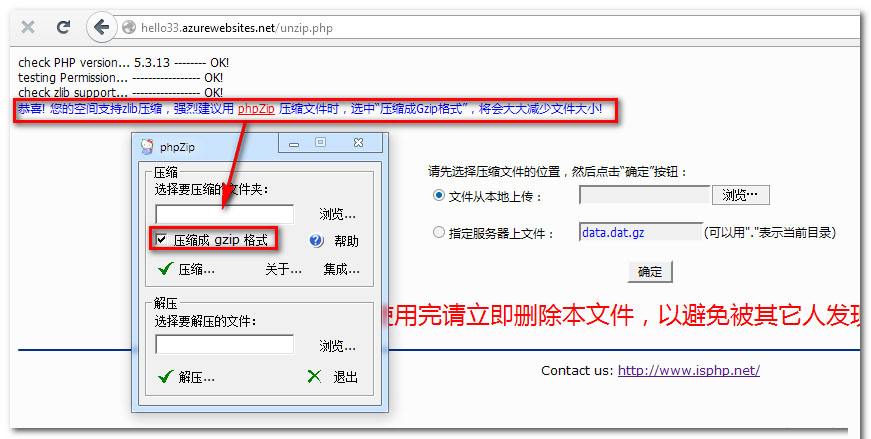首先将zip.php/unzip.php上传到服务器上,然后通过浏览器访问。页面上方有一段文字,说明你的服务器是否支持zlib库。根据这个提示我们打开phpzip.exe,设置对应的选项进行压缩: